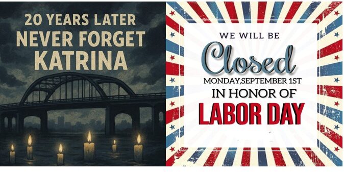 Katrina and Monday, September 1, 2025, in observation of Labor Day we will reopen Tuesday, September 2, 2025, at 8:30am.