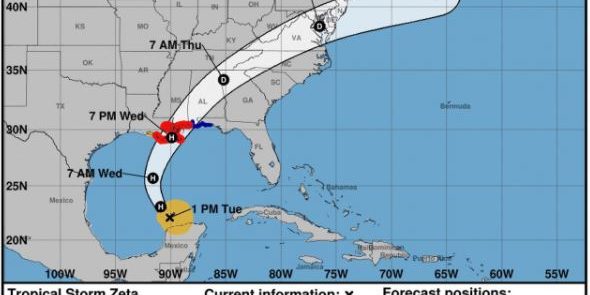 Tropical Storm Zeta has maximum sustained winds of 65mph currently but is expected to become a hurricane by late Tuesday, October 27th. Zeta is forecasted to make landfall on Wednesday, October 28, 2020.